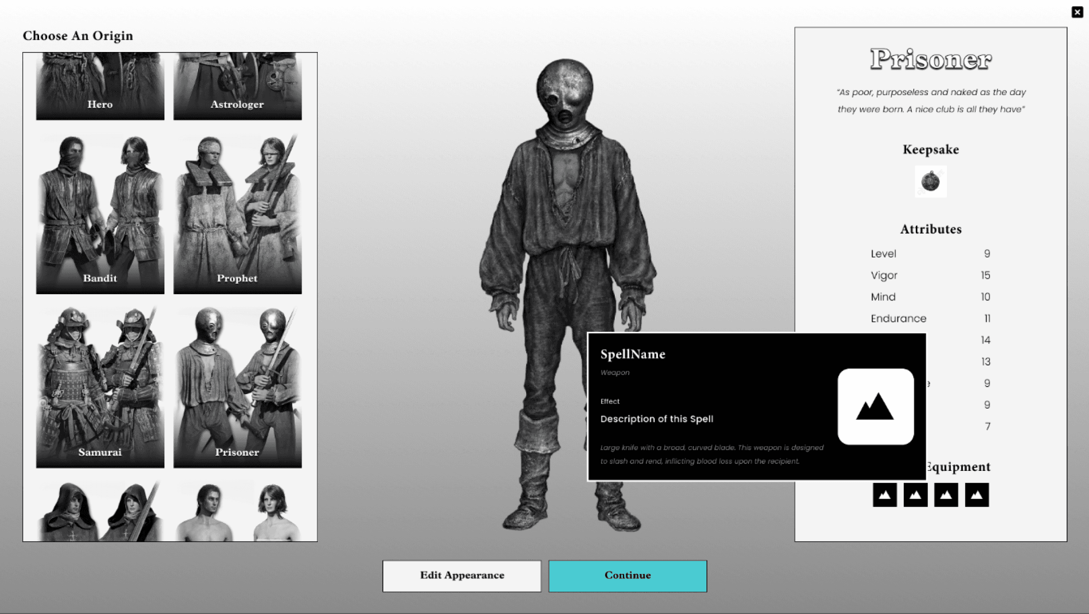 One of the challenges I had with this project was to implement the final design in a game engine. Due to the limited time I had, I only implemented the first screen and the basic functionality of selecting an Origin and updating the information based on the Origin selected.