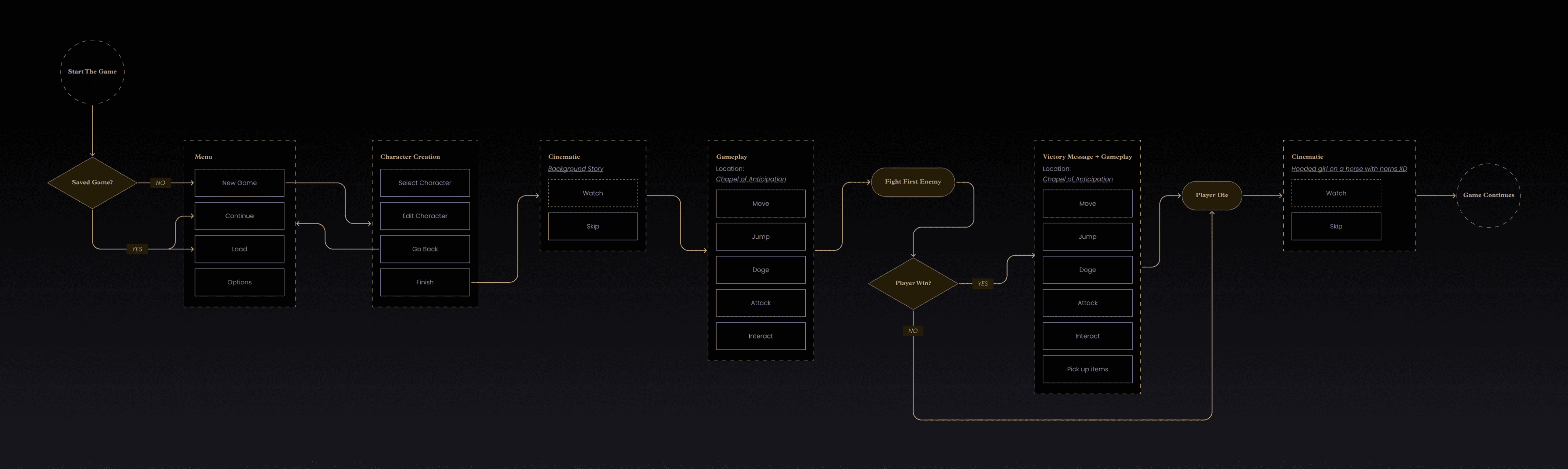 After the previous analysis I mapped how a new player interacts with the game, from starting a new game to their first encounter with an enemy. This with the aim of understanding and improving the actions available to the player on each screen.