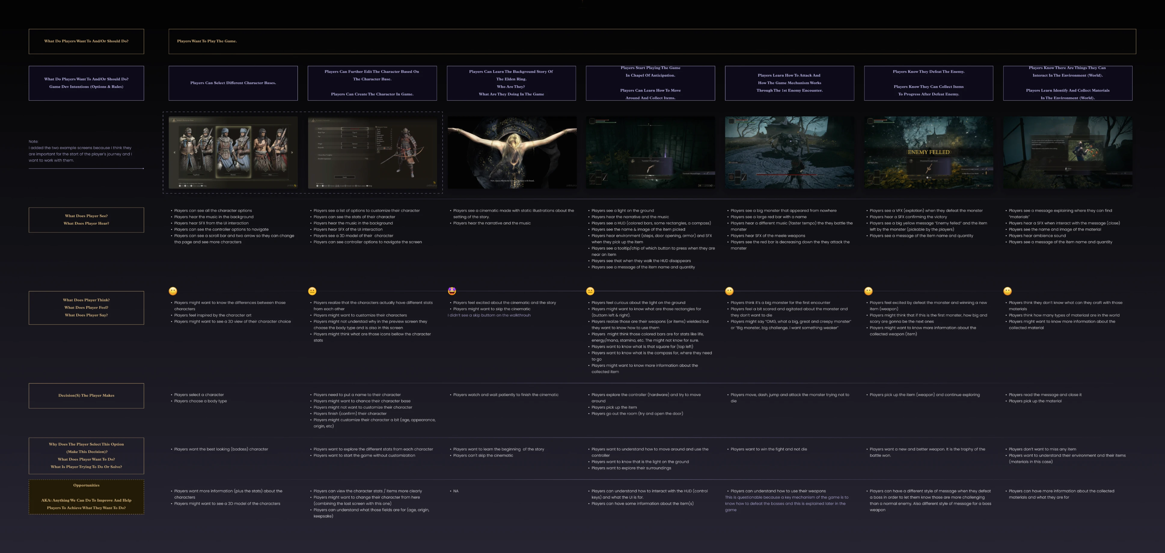 Mapped friction across the early-game flow — character creation, opening cinematic, first combat encounter. Focused on moments of hesitation: where players slowed down, reread, or gave up and randomized a choice. Two areas concentrated most of the friction: