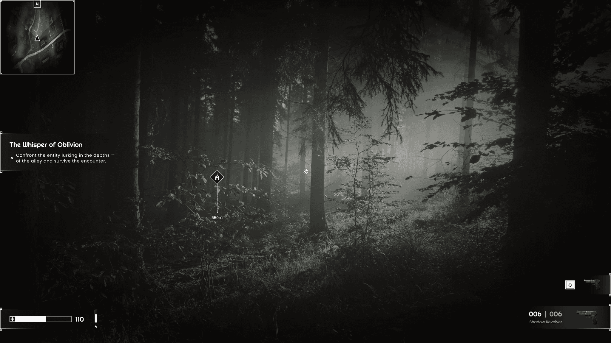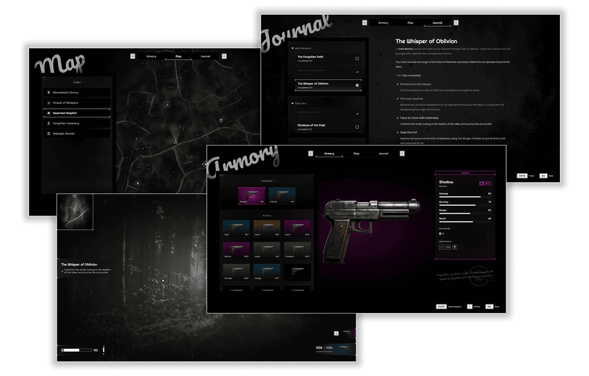 A full UI concept for a first-person horror adventure game: HUD plus Inventory, Map, and Missions.