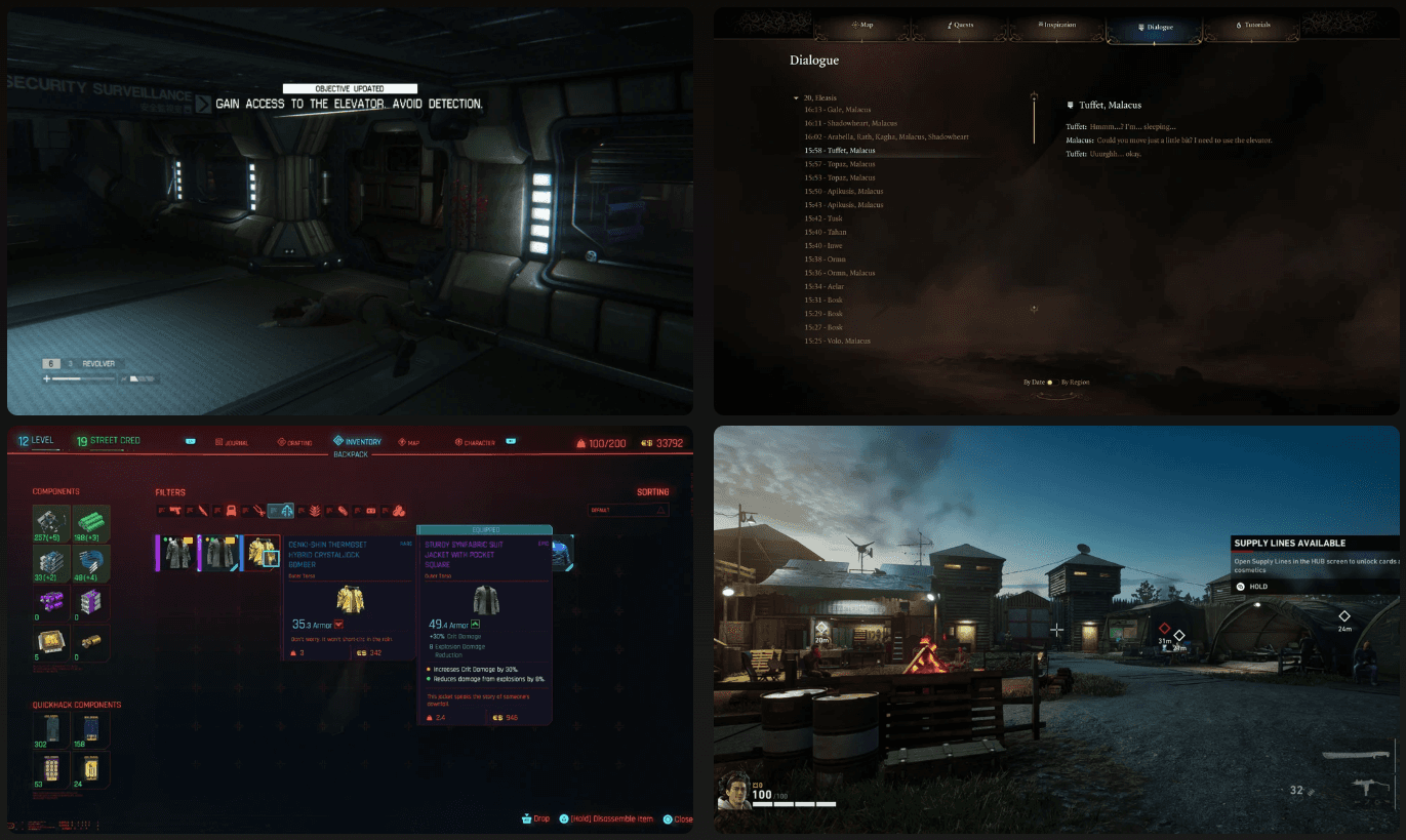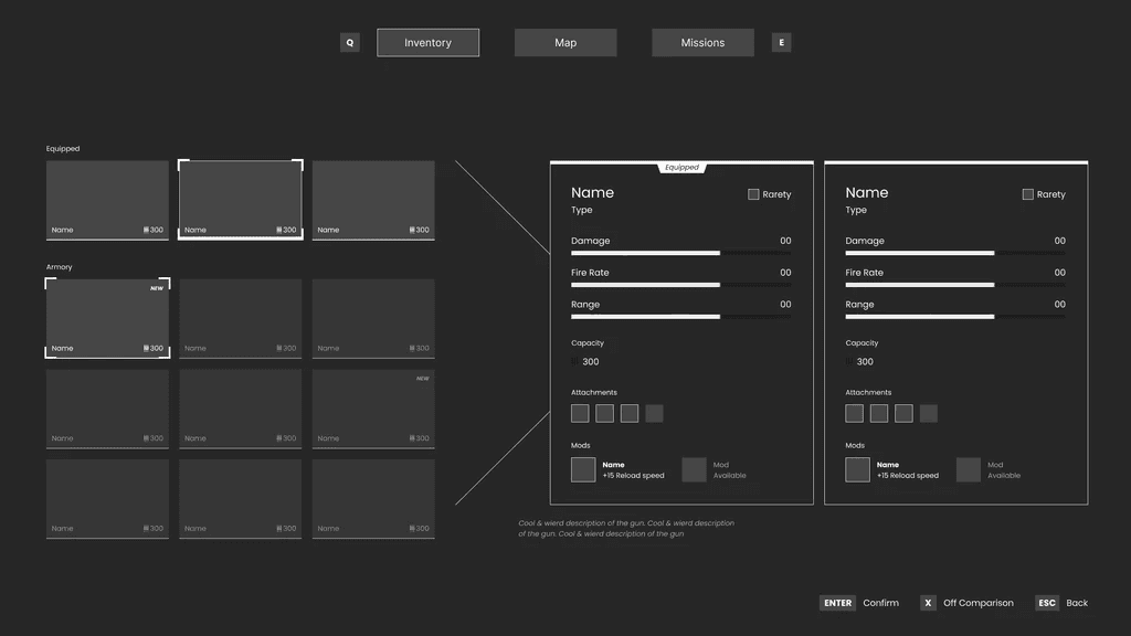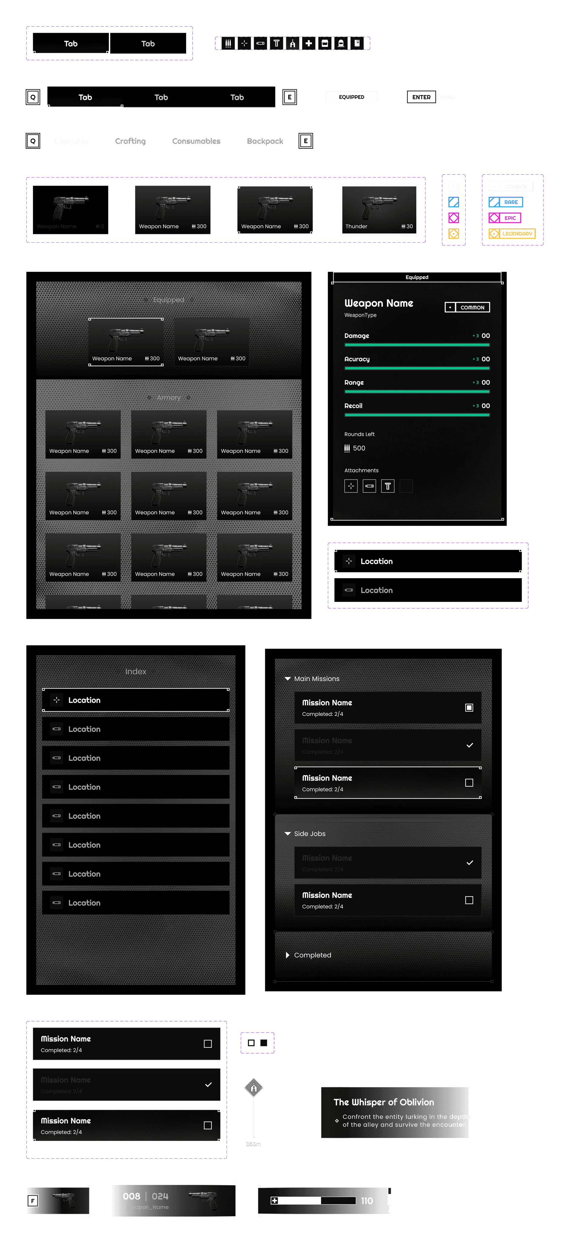 I started with wireframes oriented to PC interaction (mouse and keyboard) and then designed key components and states: navigation patterns, lists, item slots, iconography, and hierarchy rules that remain consistent across screens. The final mockups focus on building a cohesive UI set that can scale across the experience while keeping the tone and tension of horror.